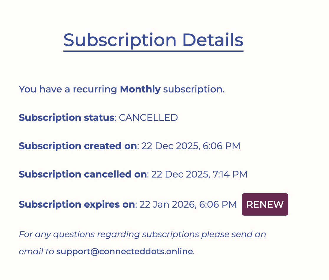 Before your subscription expiry date, you can renew a cancelled subscription by navigating to the Subscription details page (as described above) and clicking on the RENEW button next to the Subscription Expiry date.
